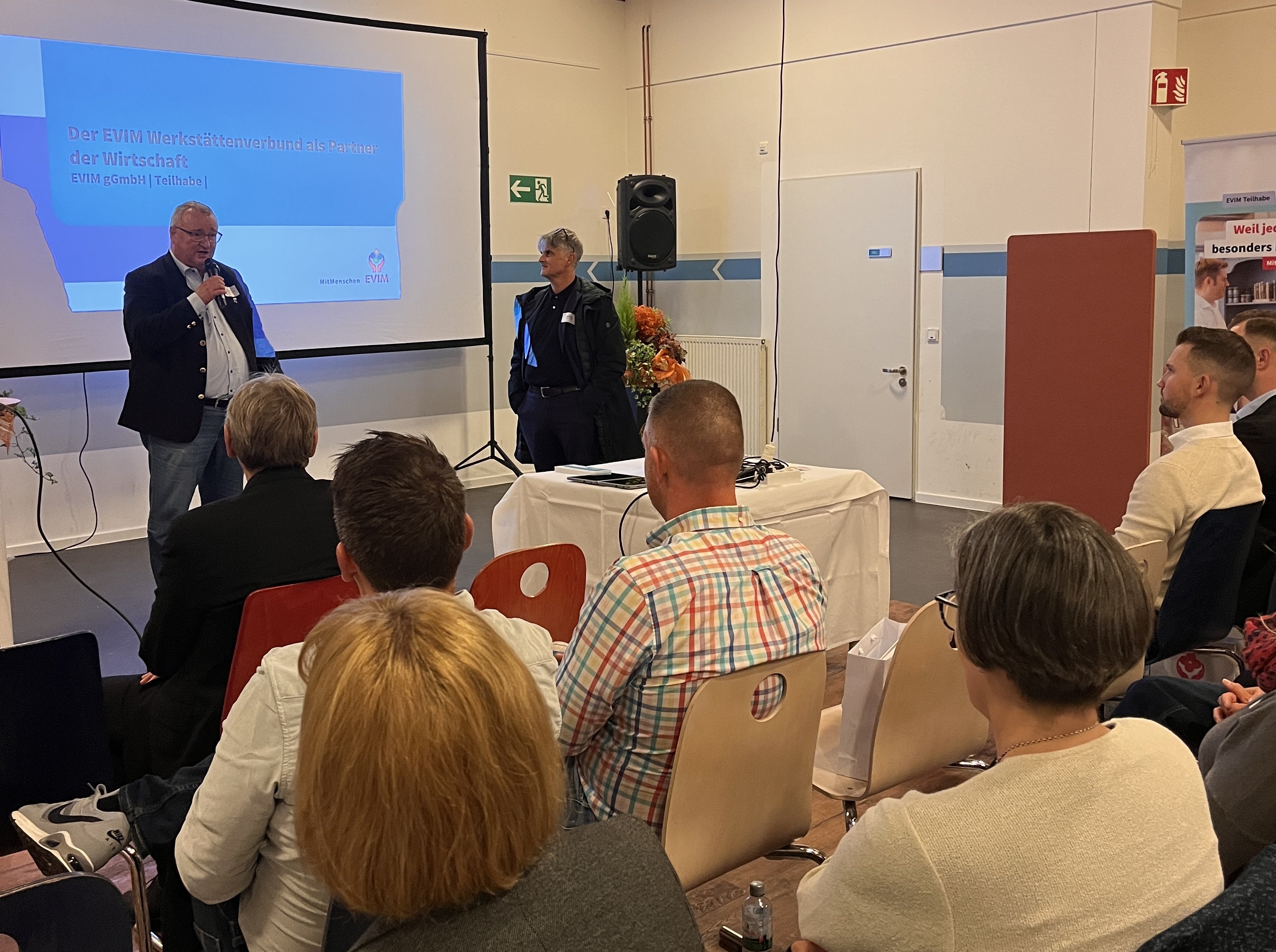 Anschließend klärte Ralf Thies, Leiter für Berufliche Integration, über „sein Herzensprojekt“ ‚Startklar‘ auf – der „erste Arbeitsmarkt“ für Menschen mit geistigen oder körperlichen Beeinträchtigungen. Der „erste Arbeitsmarkt“ bei EVIM bezieht sich auf die Vermittlung und Unterstützung von Menschen mit Behinderungen, um eine Tätigkeit auf dem allgemeinen Arbeitsmarkt zu finden. EVIM bietet dazu eine Vermittlungs- und Begleitungsstelle an, die zusammen mit den Klienten nach geeigneten Arbeitsplätzen in externen Betrieben sucht und diese durch Schulungen und Praktika vorbereitet. Das Ziel ist es, eine berufliche Integration außerhalb der EVIM-Werkstätten zu ermöglichen.
