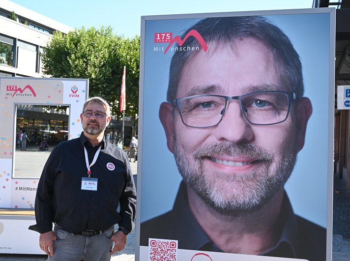 EVIM feiert 175-jähriges Jubiläum und schickt seine Wanderausstellung auf Reisen. Zweite Station nach dem Wiesbadener Schlossplatz war der Gutenbergplatz in der Mainzer Innenstadt. Die Ausstellung zeigt 20 großformatige Porträts von „Mitmenschen“ bei EVIM: Mitarbeitende, Klient:innen, Weggefährt:innen.
