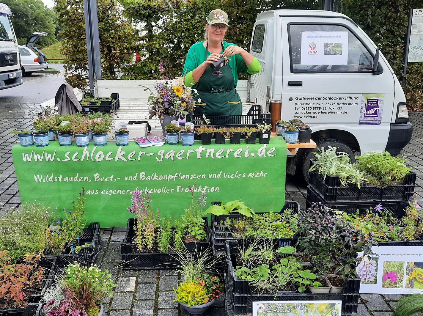“Wir bedanken uns herzlich für die Einladung und freuen uns über den gelungenen Austausch mit Gleichgesinnten. Natürlich und regional – das zählt!”, sagte Dr. agr. Irmela Harz, verantwortlich für die Produktion von ca. 100 Wildstauden-Arten am Schlockerhof. Mit Astrid Dockal (Foto), die seit vielen Jahren auf dem Schlockerhof tätig ist und Mitglied im BUND Flörsheim, waren sie am “Grünen Schlockerhof-Stand” für die Besucherinnen und Besucher gerne mit ihrem Fachwissen da.