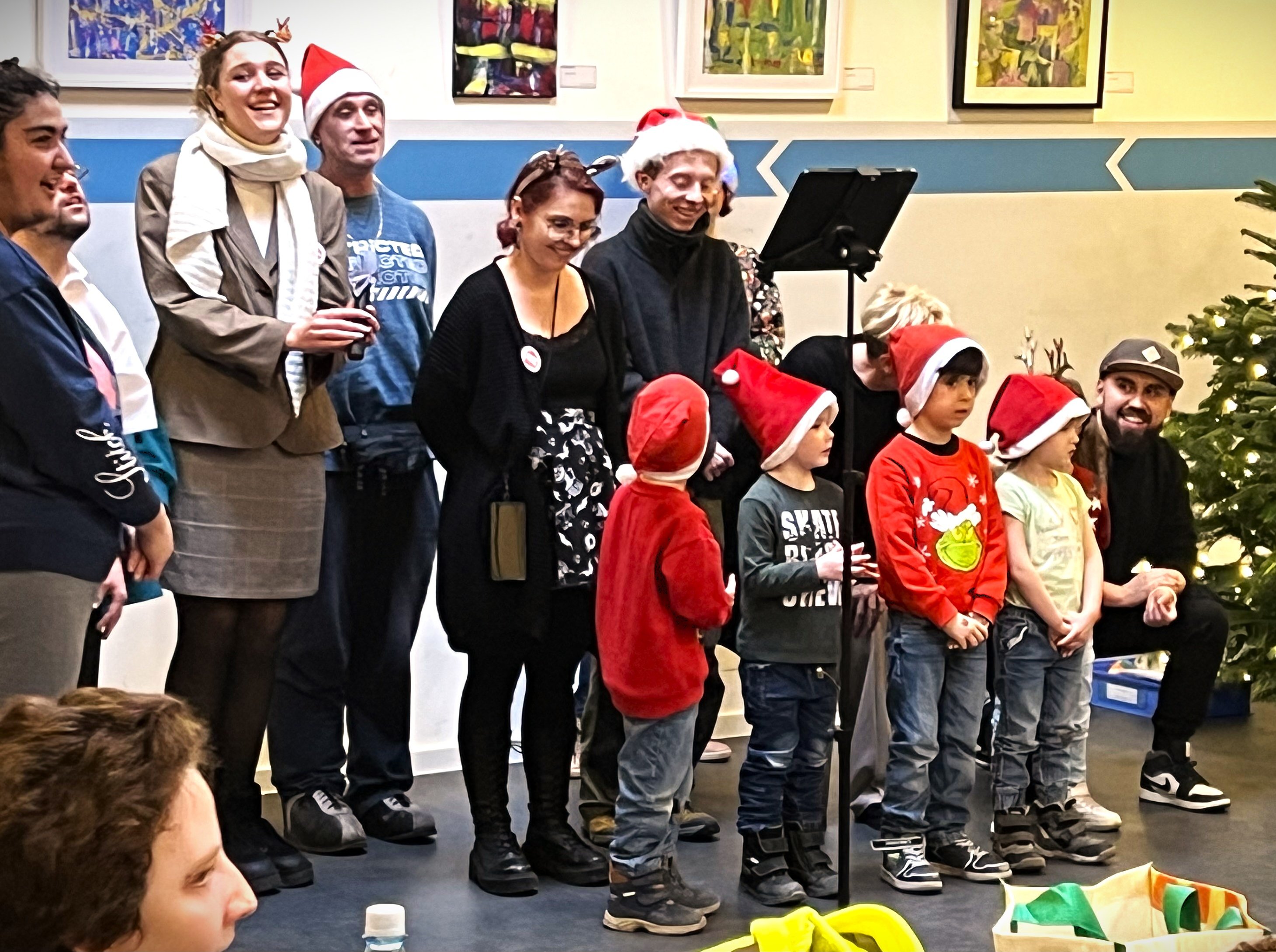 Helen Schulschenk ist noch nicht lange bei EVIM und hat bereits zwei ganz tolle Projekte auf die Beine gestellt. Die charmante junge Frau studiert soziale Arbeit und absolviert seit September ein Praxissemester in der Werkstatt an der Dürerstraße. Die musisch begabte Studentin traf mit ihrer Idee, einen Inklusions-Chor zu gründen, auf offene Ohren und Herzen in der benachbarten EVIM Kita und am Schlockerhof. Seit Oktober kommen sechs der Jüngsten bei EVIM und sangesfreudige Klient:innen einmal pro Woche in der Kita zusammen, um gemeinsam zu proben. „Anfangs waren die Kinder noch etwas schüchtern, aber das hat sich schon nach kurzer Zeit gelegt“, strahlt die Chorleiterin, die privat als Sängerin unter anderem bei Hochzeiten und Firmenevents auftritt. Dazu trugen auch die begleiteten Besuche mit jeweils einem Chormitglied aus dem Schlockerhof in der Kita bei, um sich miteinander vertraut zu machen. Mit altbekannten Weihnachtsliedern wie „Kling Glöckchen“ und „Leise rieselt der Schnee“ stimmte der neue Chor bei EVIM die zahlreichen Besucher auf die Adventsfeier ein, die zum zweiten Mal in diesem Format stattfand.