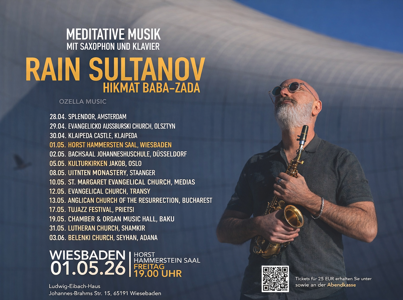 Mit einem außergewöhnlichen Konzert macht der aserbaidschanische Saxophonist und Komponist Rain Sultanov am Freitag, 1. Mai 2026, auf seiner Tournee Station in Wiesbaden. Im Horst-Hammerstein-Saal präsentiert einer der prägenden Vertreter der aserbaidschanischen Jazzszene ein Programm mit meditativer, atmosphärisch dichter Musik. Begleitet wird er vom Pianisten Hikmat Baba-Zada.