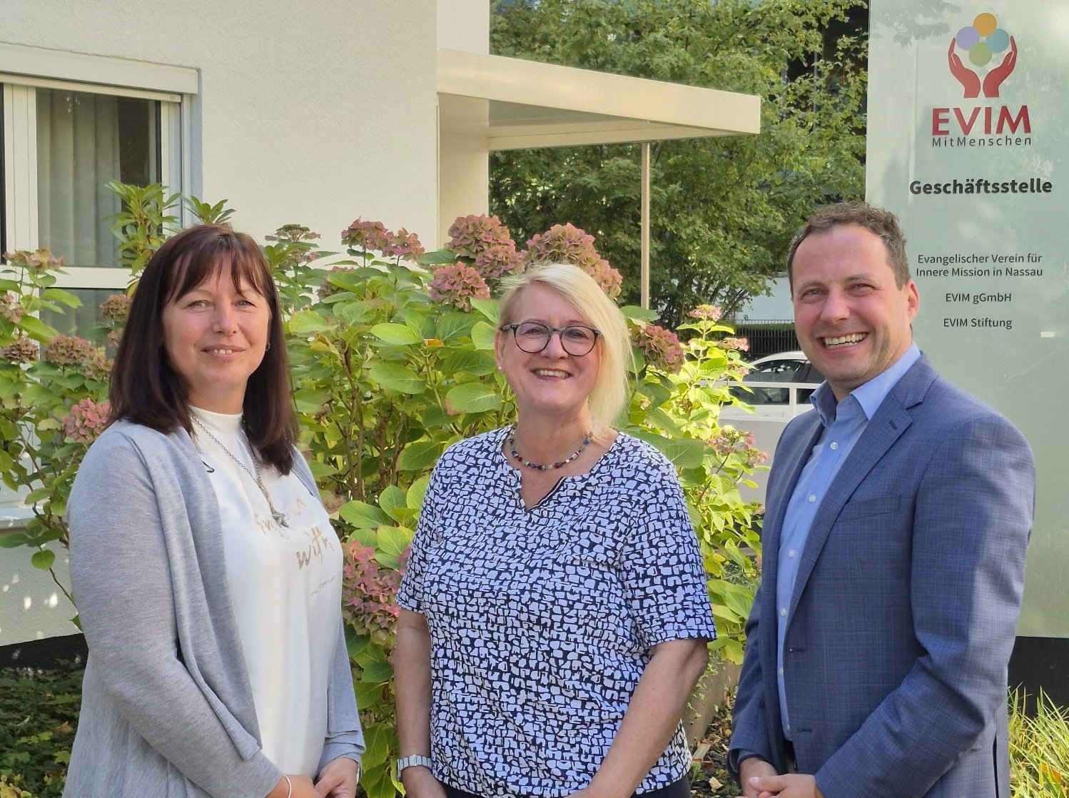 Ilka Müller und Björn Bätz, Geschäftsführende der EVIM gGmbH in den Bereichen Altenhilfe und Teilhabe begrüßten Mitte September Susanne Hoffmann-Fessner (SPD), Stadtverordnete und Vorsitzende der SPD Wiesbaden (2.v.l.) zu einem Kennenlerngespräch und Austausch über vielfältige soziale Fragen in der EVIM Geschäftsstelle: Wie können wir zukünftig unsere sozialen Strukturen neu denken? Alt und Jung zusammenbringen, Teilhabe ermöglichen und gute Arbeits- und Lebensbedingungen schaffen? Dabei konnten Herausforderungen in den Zuständigkeitsbereichen sondiert und erste Ideen für mögliche Vorhaben entwickelt werden.