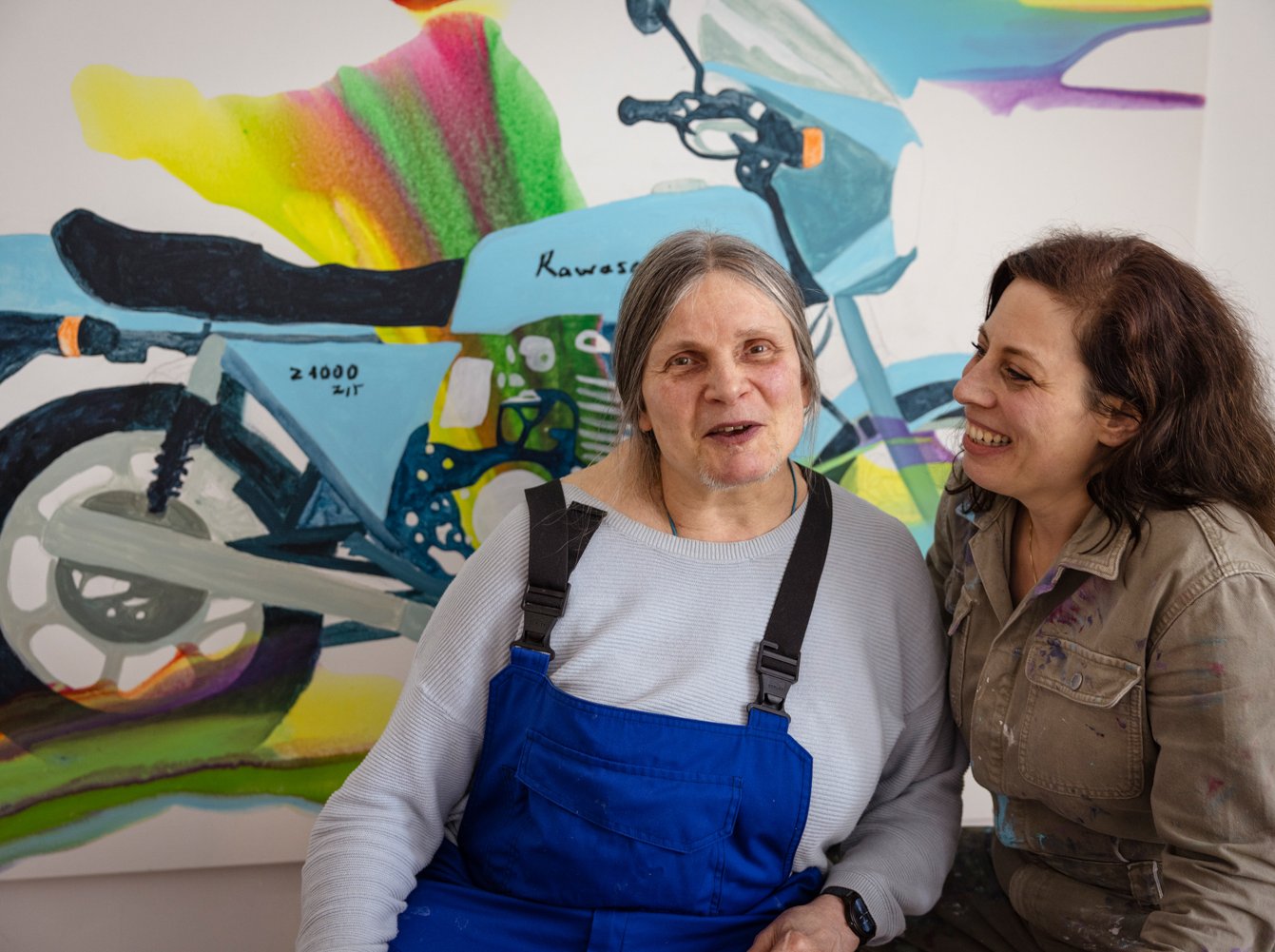 Jenny Martin lebt in einem Wohnhaus der EVIM Teilhabe. Die 66-Jährige fühlt sich dort wohl. Sie besucht seit vielen Jahren regelmäßig das Kunstatelier von Artjom Chepovetskyy im Eigenheim-Viertel und malt dort. Sie ist vor 40 Jahren mit ihrem Motorrad verunglückt und zog sich schwere Kopfverletzungen zu, lag lange im Koma und saß dann im Rollstuhl, doch sie hat sich wieder ins Leben gekämpft. An ihr Motorrad denkt sie heute noch, eine blaue Kawasaki. Und zum ersten Mal kann sie sich bei diesem mehrwöchigen Projekt auch künstlerisch dem Thema nähern: In Zusammenarbeit mit der Künstlerin Katrin Kampmann aus Berlin hat sich das Duo darauf geeinigt, dass das gemeinsame Bild die Kawasaki als Motiv haben wird. Kampmann studierte an der Universität der Künste in Berlin und ist für ihre farbstarken Porträts bekannt. Ihre Bilder hängen auch im Kunsthaus Taunusstein in der Sammlung Haas van Gemmeren und in anderen privaten Sammlungen. Die beiden Frauen verstehen sich ausgezeichnet, das Bild hat Anteile beider. Jenny Martin malt akribisch die Details der Maschine, Katrin fügt ihre großen Farbschwünge hinzu. Als erstes wird jeden Tag ein Kaffee mit Kondensmilch und Süßstoff getrunken, wenn Katrin Kampmann Jenny Martin vor dem Gebäude abholt, wo sie pünktlich mit dem Taxi eintrifft. Dann wird Musik aufgelegt, die zum Motorradfahren passt und Jenny Martin fühlt sich wieder jung, schaut ihr altes Foto an, auf dem sie als junge Frau mit der schweren Maschine zu sehen ist und vergisst alles andere. (Text: Anja Baumgart-Pietsch, Fotos: rui camilo)