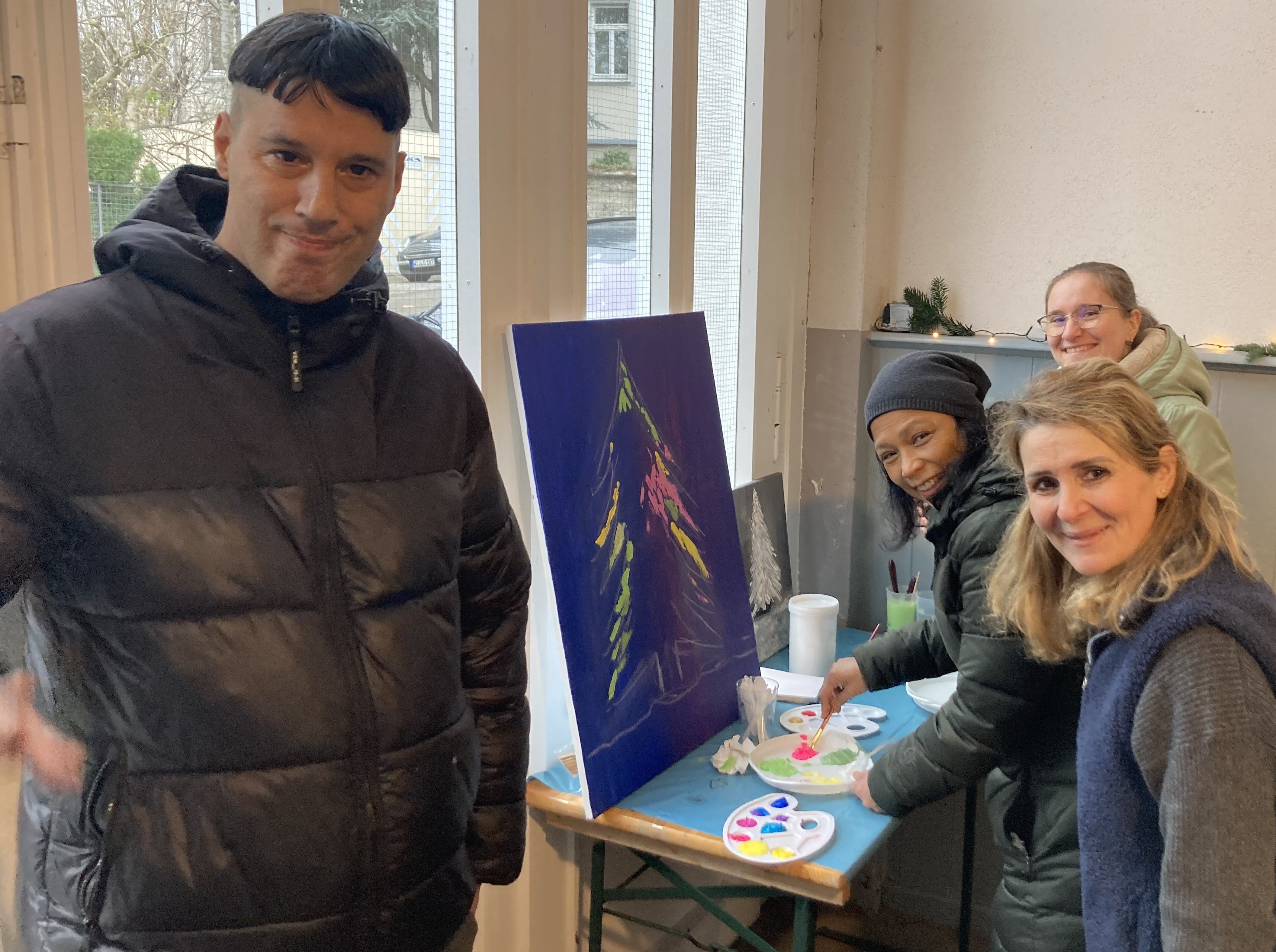 Ein besonderer Höhepunkt war das gemeinsame Action Painting: Mit Spachtel und Farbe gestalteten die Besucher:innen ein gemeinschaftliches Kunstwerk in Form eines Weihnachtsbaumes. Das entstandene Bild erinnerte im Wohnzimmer der Kapellenstraße an diesen besonderen Nachmittag und das gelungene Fest.